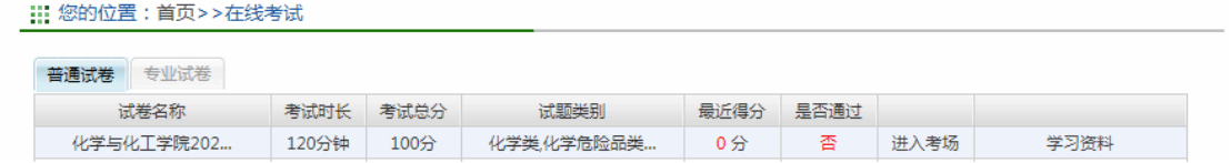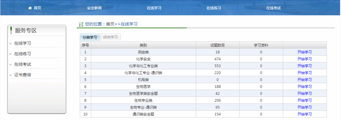 点击菜单栏“在线学习”,可以练习考试试题(试题范围包括:化学危险品类、化学与化工专业-通识类和化学安全等知识)。