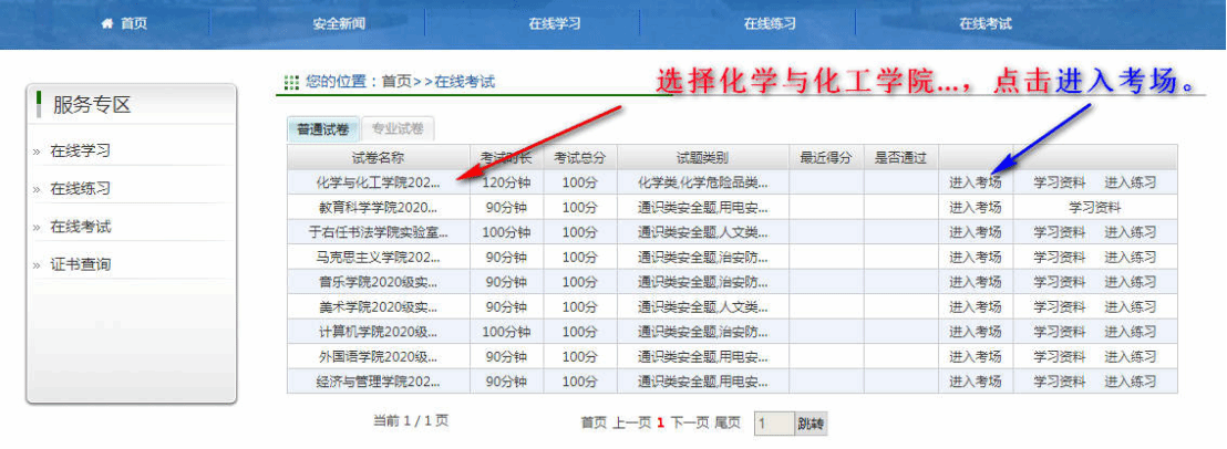 1.点击菜单栏“在线考试”,选择对应试卷,进入考场;