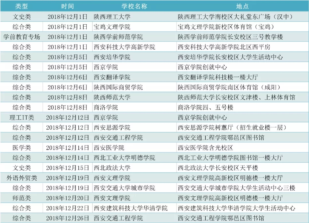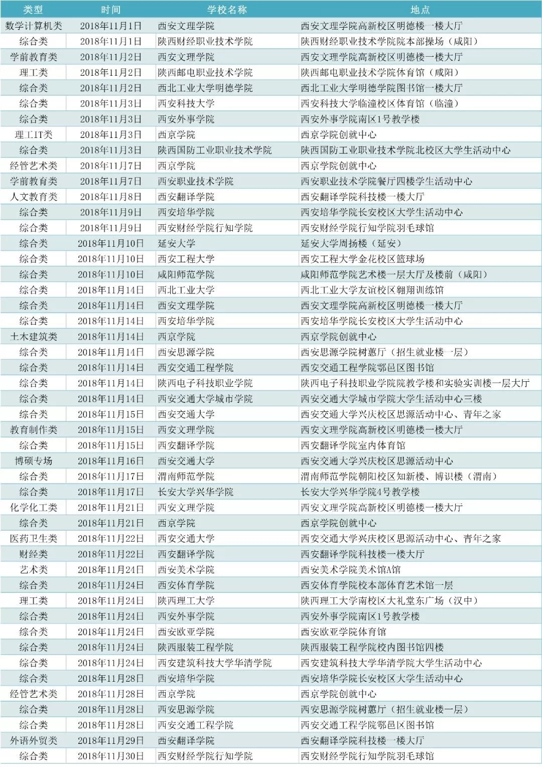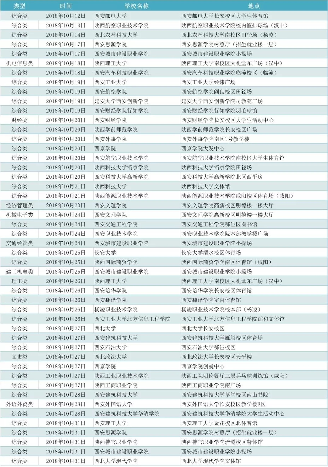 省教育厅和各高校还将陆续举办各类中小型和专场校园招聘会,相关信息请关注陕西省教育厅门户网站(http://jyt.shaanxi.gov.cn/)、陕西省高等公司毕业生就业服务中心网站(http://www.sxgxbys.com/)。具体场次安排见下图。