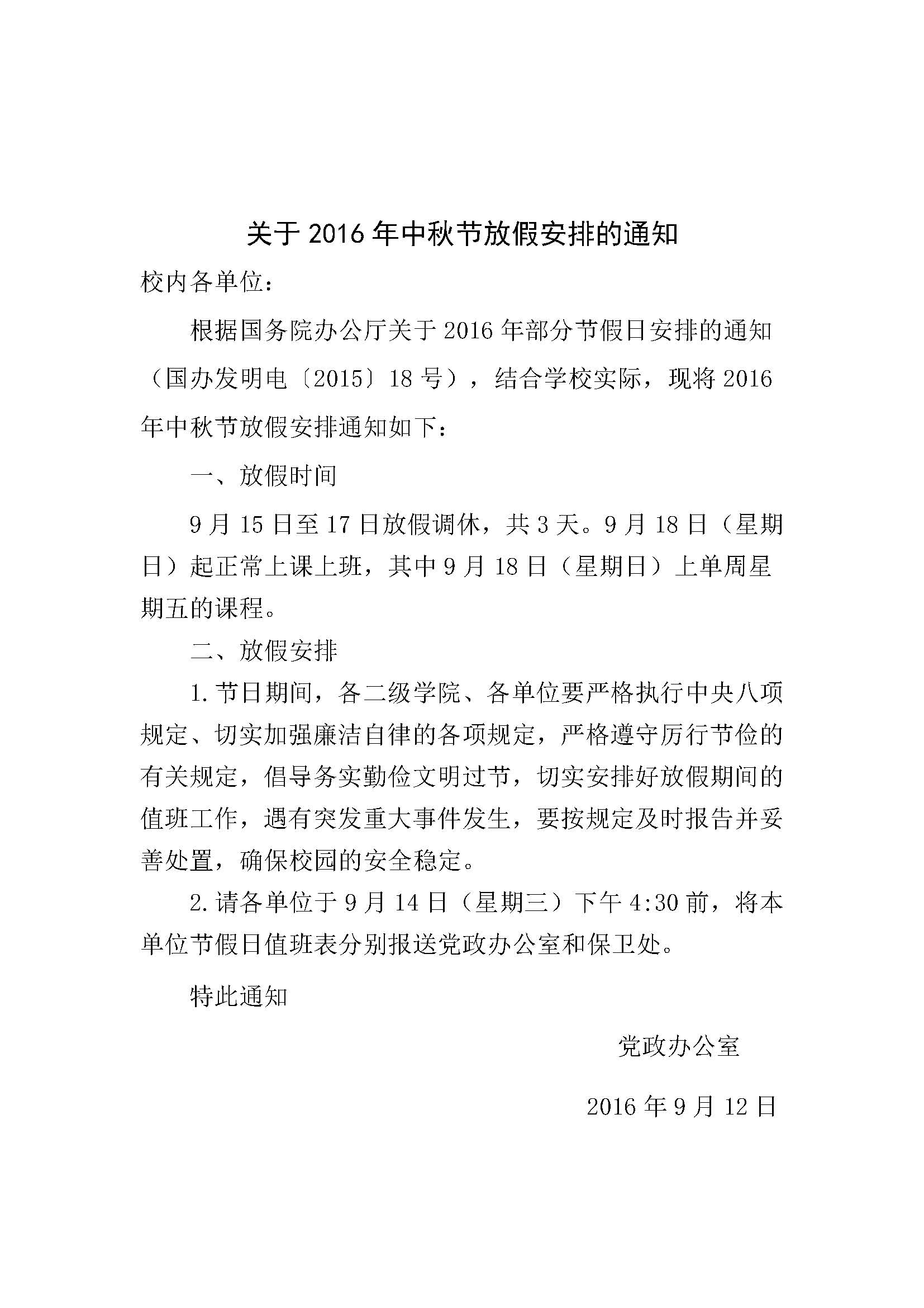 关于2016 年中秋节放假安排的通知